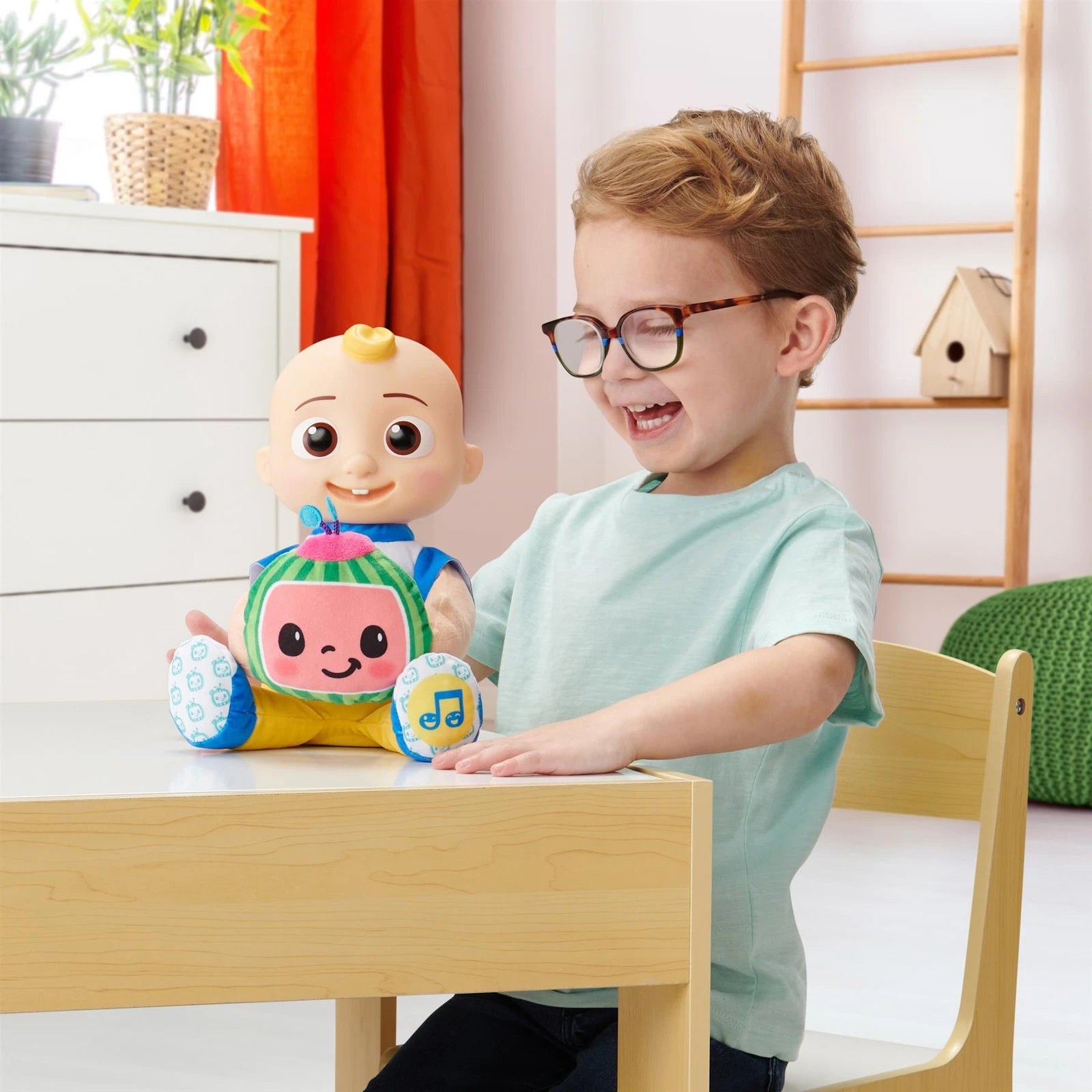 Peek-a-Boo... I see you!" It's time to play every little one's favourite playtime game with Peek-A-Boo JJ! Press JJ's foot to start the fun and sing along to a clip of the fan-favourite song, "Peek a Boo"!